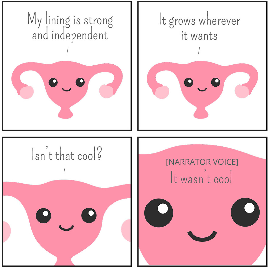 I came across her comic one day as I was searching for funny Endometriosis memes. Please enjoy the comic below. You can support her art and access her merch by visiting these shops: